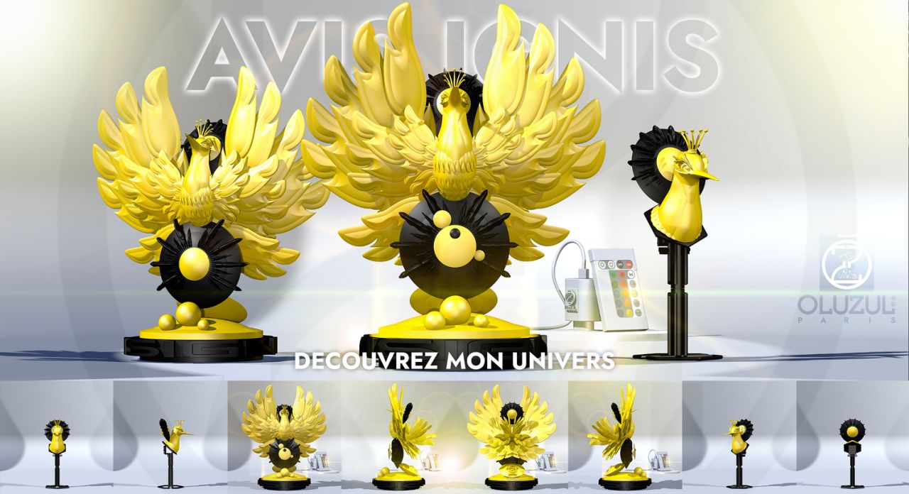 est une sculpture avec horloge qui est alimentée par une pile AA. La sculpture possède également un plateau tournant fournie avec un accu AA rechargeable grâce à son câble USB. Cette création est aussi une lampe LED accompagnée d'une télécommande multifonctions et sa pile bouton.